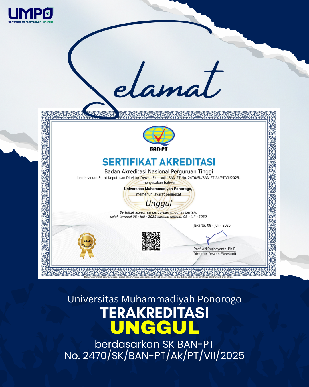 Universitas Muhammadiyah Ponorogo (UMPO) resmi meraih peringkat akreditasi Unggul, sebuah capaian prestisius yang menunjukkan kualitas pendidikan, fasilitas, dan manajemen